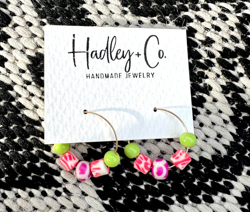 Green pink coral beaded Hadley + co hoop earrings