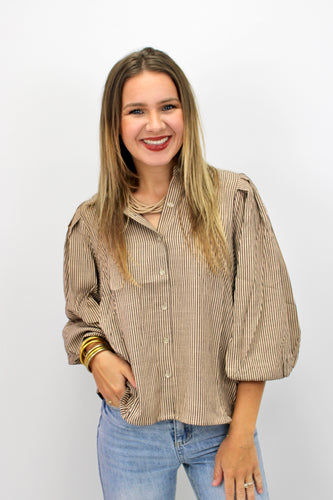 Brown stripe button balloon sleeve top