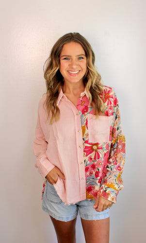 Pink floral button down top