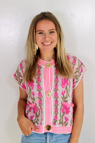 Pink flower gold button top- last chance