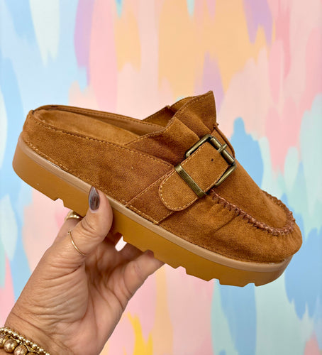 Tan slide on buckle shoes